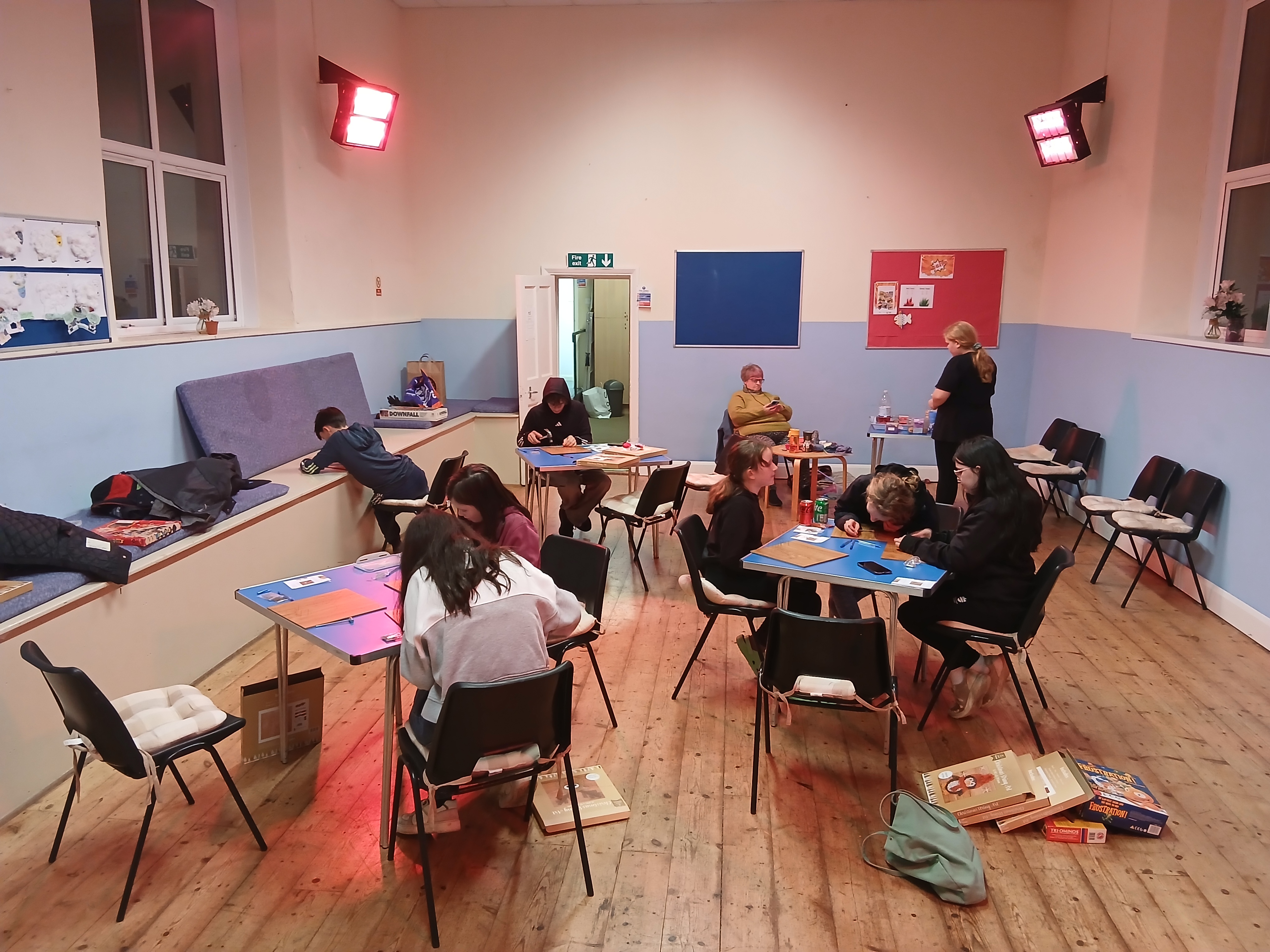 During school term time, from 7.00pm to 8.30pm, young people in school Year 6 and upwards are invited to simply come and 'hang' with their friends in a warm, relaxed, safe environment. The evening starts with a variety of board-games; table football and pool as well as a tuck-shop. At 7.30pm the young people are given the opportunity to engage in a more structured activity which might be a craft, cooking, choir and discussion sessions on topical issues. To cover costs for these activities there is a small charge of £1.50 per young person per session.